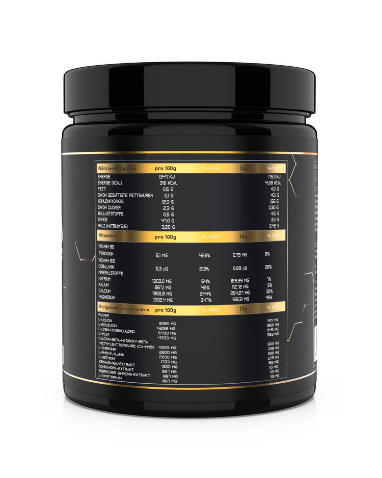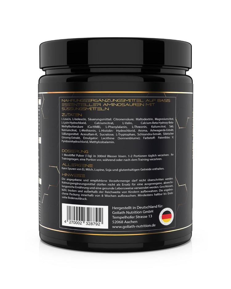 Unsere Infusion EAA´s besitzen eine besonders wirkungsvolle Elektrolyt und Performance Matrix. Sie enthalten, neben den gängigen acht Aminosäuren, mit Histidin, alle NEUN essenziellen Aminosäuren für eine optimale und vollständige Muskelproteinsynthese. EAA sind für den Körper unverzichtbar, da sie nicht selbst hergestellt werden können und daher über die Nahrung oder Nahrungsergänzungsmittel aufgenommen werden müssen. Sie spielen eine wichtige Rolle beim Aufbau und Erhalt von Muskelmasse, der Regeneration von Gewebe und der Unterstützung des Immunsystems.Außerdem ist, neben weiteren Komponenten, auch Ashwaganda-Extrakt enthalten. Dieses drückt während des Trainings dein Stresshormonlevel leicht nach unten, damit du länger leistungsfähig im Training bist. Daher ist dieses Produkt perfekt für dein Intra-Workout geeignet um dem katabolem Teufel den Kampf anzusagen! Bestelle jetzt und verbessere deine Performance!