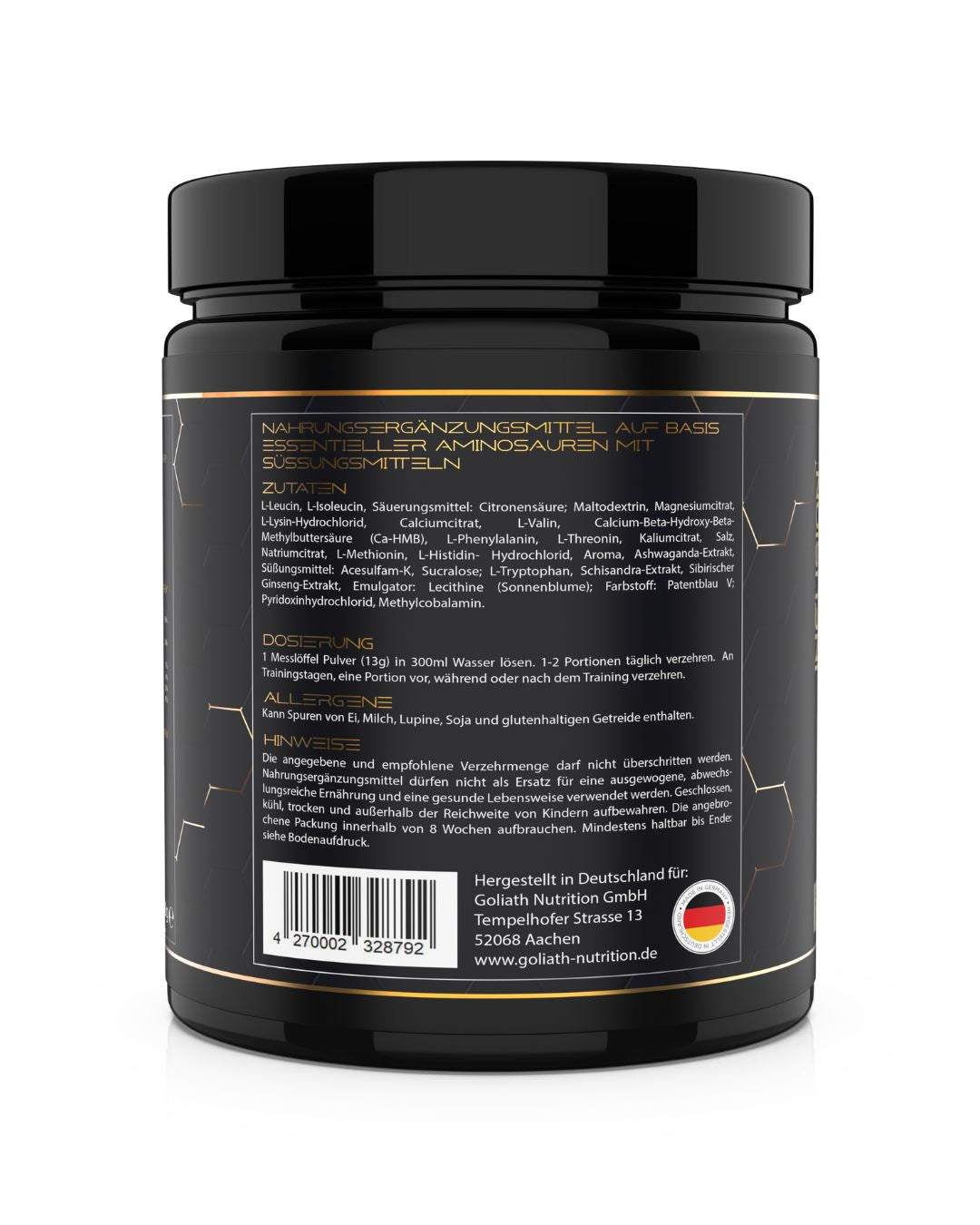Unsere Infusion EAA´s besitzen eine besonders wirkungsvolle Elektrolyt und Performance Matrix. Sie enthalten, neben den gängigen acht Aminosäuren, mit Histidin, alle NEUN essenziellen Aminosäuren für eine optimale und vollständige Muskelproteinsynthese. EAA sind für den Körper unverzichtbar, da sie nicht selbst hergestellt werden können und daher über die Nahrung oder Nahrungsergänzungsmittel aufgenommen werden müssen. Sie spielen eine wichtige Rolle beim Aufbau und Erhalt von Muskelmasse, der Regeneration von Gewebe und der Unterstützung des Immunsystems.Außerdem ist, neben weiteren Komponenten, auch Ashwaganda-Extrakt enthalten. Dieses drückt während des Trainings dein Stresshormonlevel leicht nach unten, damit du länger leistungsfähig im Training bist. Daher ist dieses Produkt perfekt für dein Intra-Workout geeignet um dem katabolem Teufel den Kampf anzusagen! Bestelle jetzt und verbessere deine Performance!