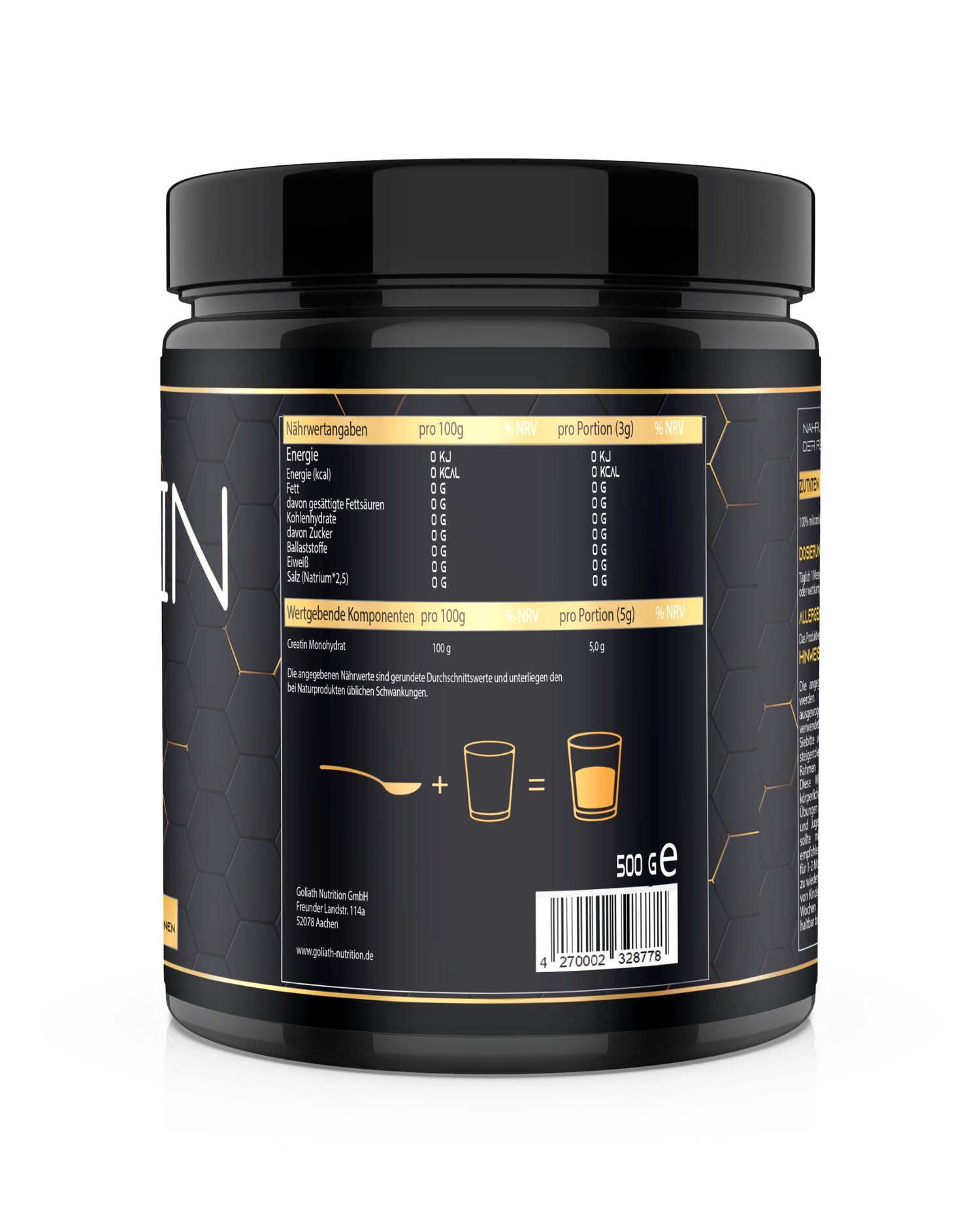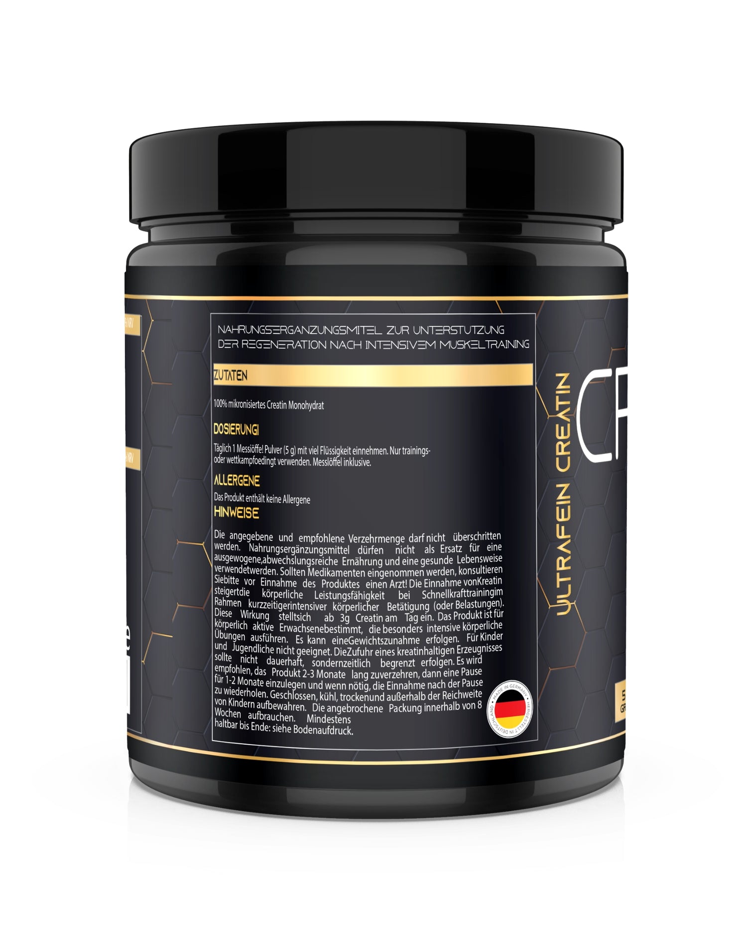 ULTRAFEIN CREATIN – Mit unserem ULTRAFEIN CREATIN Monohydrat erhältst du ein hochwertiges Nahrungsergänzungsmittel, welches deine körperliche Leistungsfähigkeit bei kurzen, intensiven Belastungen effektiv verbessert. Creatin versorgt deine Muskeln mit Energie, indem es die Resynthetisierung von ADP und Krp zu ATP unterstützt. Dadurch kannst du eine Leistungssteigerung sowohl bei Kraft- als auch bei Kraftausdauer-Übungen erreichen und deine Regenerationszeiten verkürzen. Eine Wassereinlagerung in der Muskulatur kann für einen optischen Effekt sorgen. Das größere Muskelvolumen und die verbesserte Leistungsfähigkeit, durch die verbesserte Resynthese, ermöglicht eine höhere Reizsetzung und damit auch theoretisch schnelleren Muskelzuwachs.