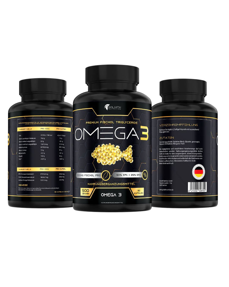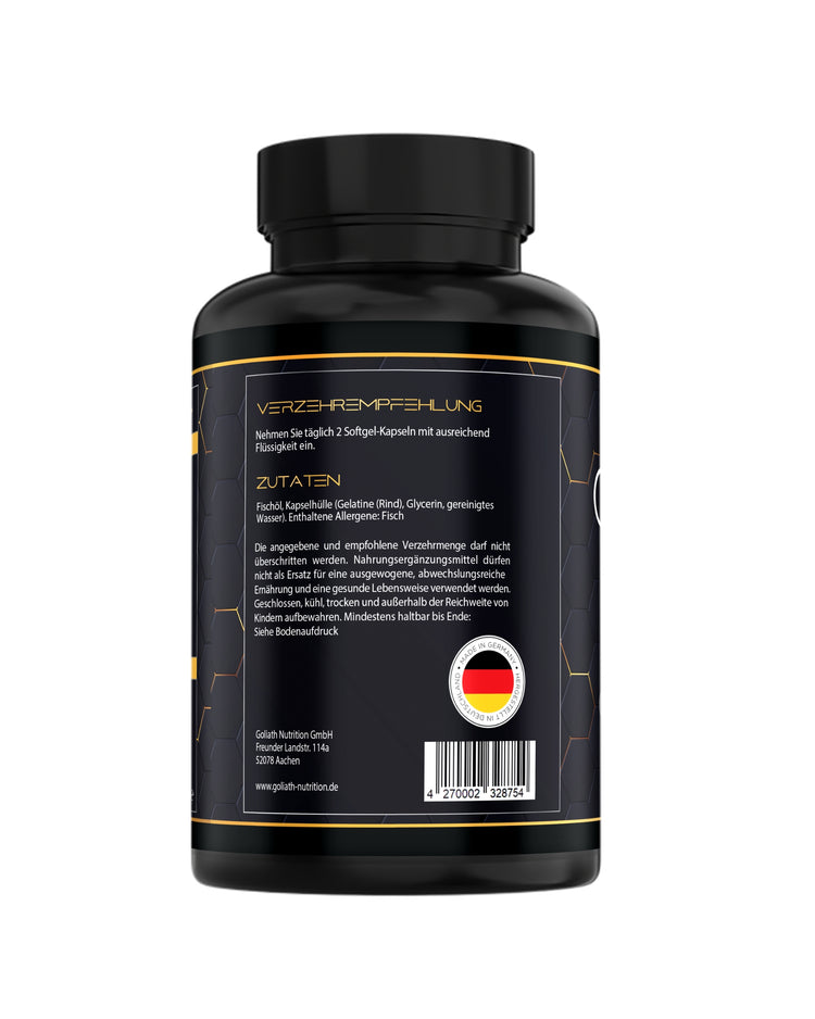 Unsere Omega 3 Fettsäuren sind von höchster Qualität und Reinheit, bestehen ausschließlich aus Premium Triglyceriden und enthalten ein optimales Verhältnis von 25% DHA und 50% EPA für eine optimale Bioverfügbarkeit. Anders als andere Omega 3 Produkte enthalten sie kein Vitamin E, welches, in Kombination, bei einigen Menschen zu Unverträglichkeiten führen könnte. Omega 3 Fettsäuren haben zahlreiche positive Effekte auf den menschlichen Körper. So können sie unter anderem die Herz-Kreislauf-Gesundheit fördern, das Immunsystem unterstützen, Entzündungen hemmen und das Gehirn sowie die Augen schützen.